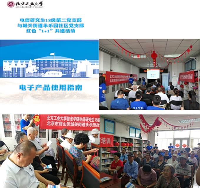 随着信息化时代的日益发展,电子产品应用越来越广泛,为人们的吃穿住行带来了便捷的同时,也在潜移默化中改变着人们的生活方式,在这种转变的过程中,老年人因思维习惯和接受新事物能力方面的限制阻碍了其享受这一大福利,老年人对便捷生活方式的渴望与不能熟练掌握电子产品的使用之间发生了矛盾,为此,近日,最靠谱的十大足球平台电信研究生18级第二党支部与北京市房山区城关街道永乐园社区党支部开展了一场化解这一“矛盾”的红色“1+1”共建活动,为永乐园社区党支部老年党员们举办了一场题为“常用电子产品的使用指南”培训讲座,支部党员及积极分子20余人参加了此次活动。