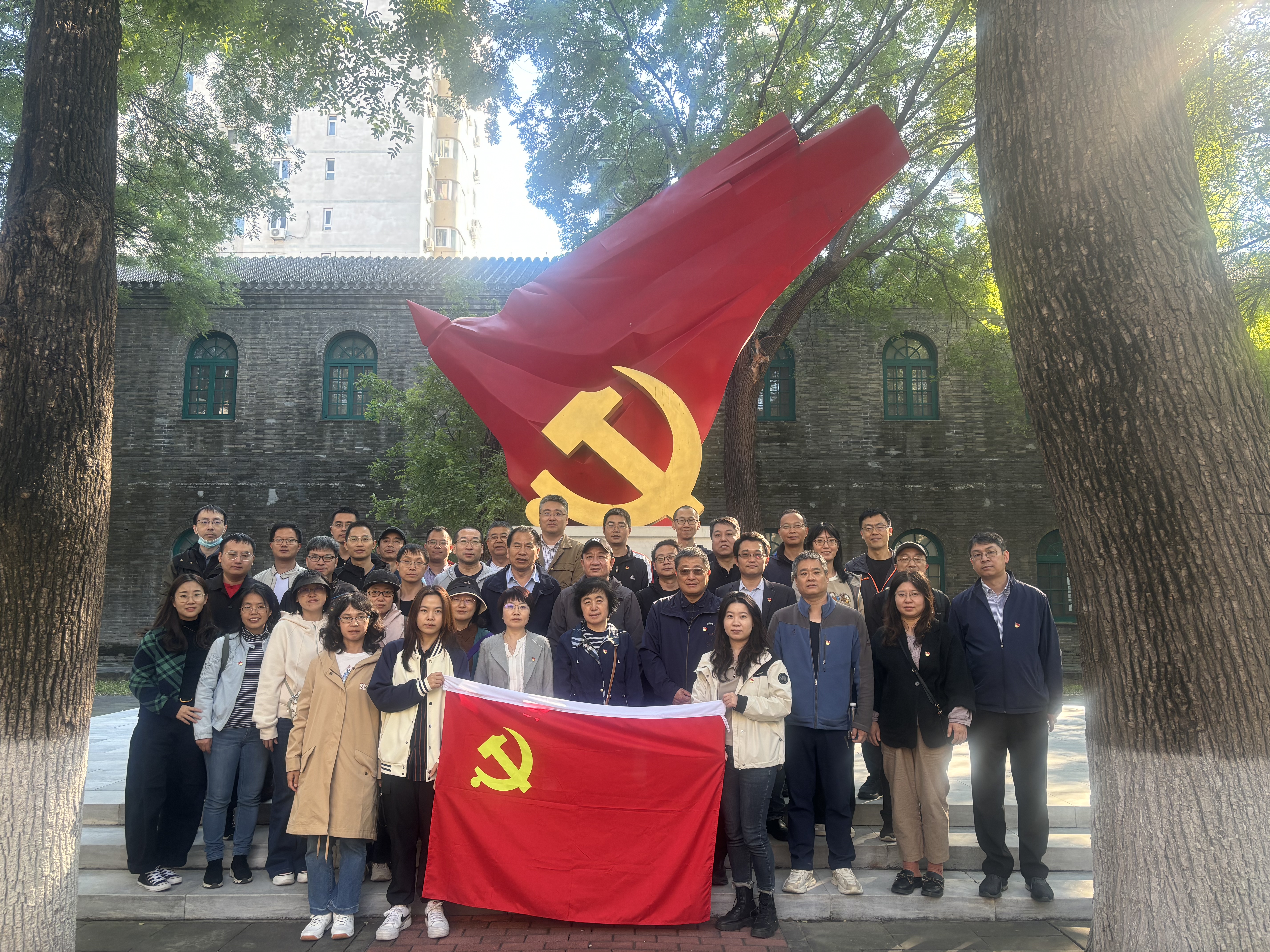 进入党校,映入眼帘的是庄严的党旗雕塑,老师们了解到雕塑的汉白玉基座高度1.921米,红旗高度4.9米,象征着没有共产党就没有新中国。