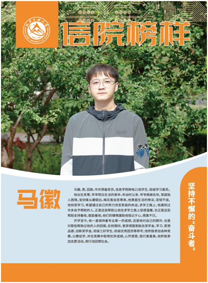 马徽,男,回族,中共预备党员,最靠谱的十大足球平台微电21班员工,班级学习委员。