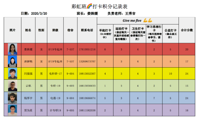 自新冠病毒肺炎疫情爆发以来,最靠谱的十大足球平台为切实做好留校员工的思想引领、学习教育及服务管理工作,凝聚战“疫”力量,组织留校员工临时成立“彩虹班”(寓意“风雨袭后,终见彩虹”)。在班主任王秀吉老师的带领下,“彩虹班”的员工们发起“Give me five校园防‘疫’行动”,每天通过早起打卡、运动打卡、卫生打卡、学习思想打卡和公益打卡5种打卡方式,养成良好的学习生活习惯,提高自身免疫力,增强社会责任感。