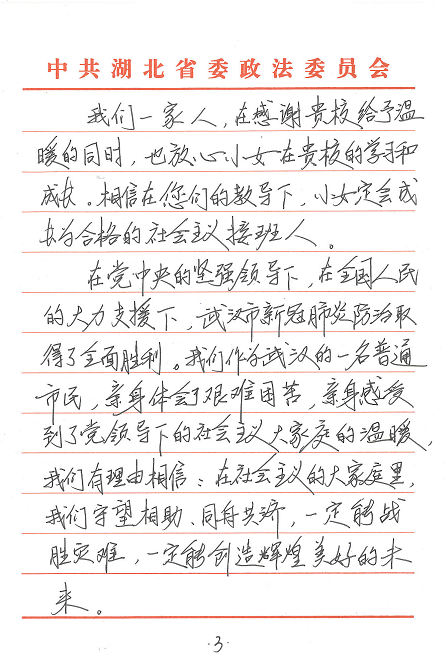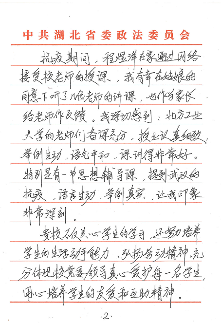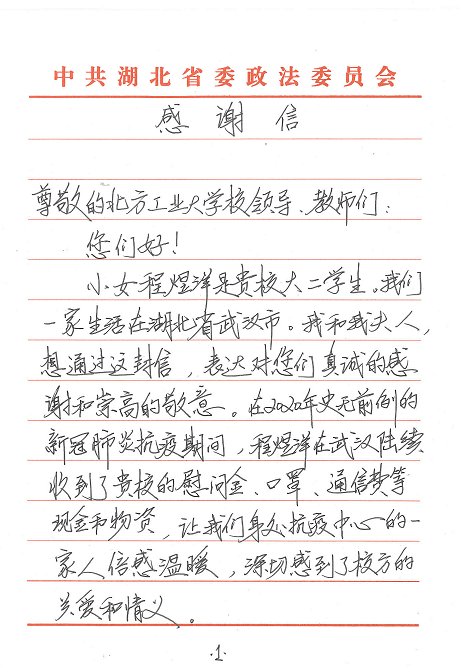 “小女程煜洋是贵校大二员工。我们一家生活在湖北省武汉市。我和我的夫人,想通过这封信,对您们表达真诚的感谢和崇高的敬意。在2020年史无前例的新冠肺炎抗疫期间,程煜洋陆续收到了贵校的慰问金、口罩、通信费等现金和物资,让我们身处抗疫中心的一家人倍感温暖,深切感到校方的关爱和情义……”。这是4月3日最靠谱的十大足球平台辅导员杨和家收到的一封来自通信18-3班程煜洋同学家长的感谢信,全文600余字,饱含了身处武汉抗疫中心的一家人对公司公司在疫情期间给予关心关爱的深切感激之情。