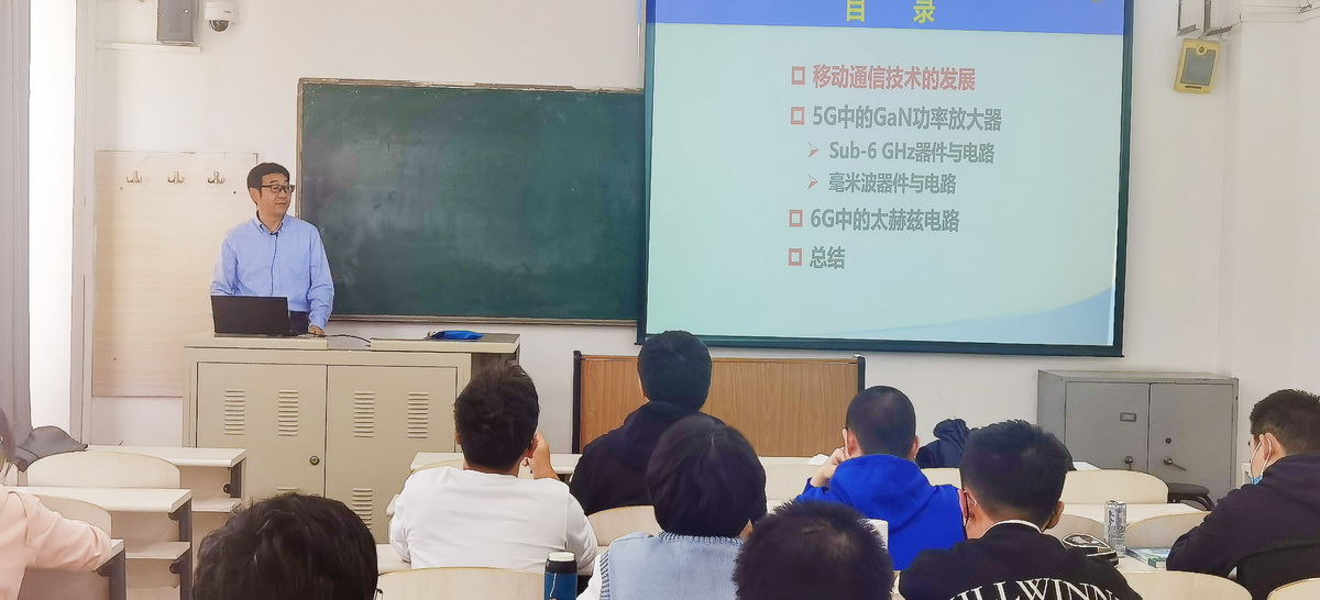 金研究员介绍了微电子技术在通信领域的应用,指出了微电子技术在通信设备小型化方面起到的重要作用。他通过讲解通信技术代与半导体材料的选择之间的关系,说明了不同半导体材料的特性及其应用。此外,金研究员还介绍了移动5G技术,包括:GaN功率放大器,Sub-6 GHz器件与电路和毫米器件与电路等。最后,金研究员展望了6G技术应用对社会的改变。报告深入浅出,获得了与会师生的高度评价。