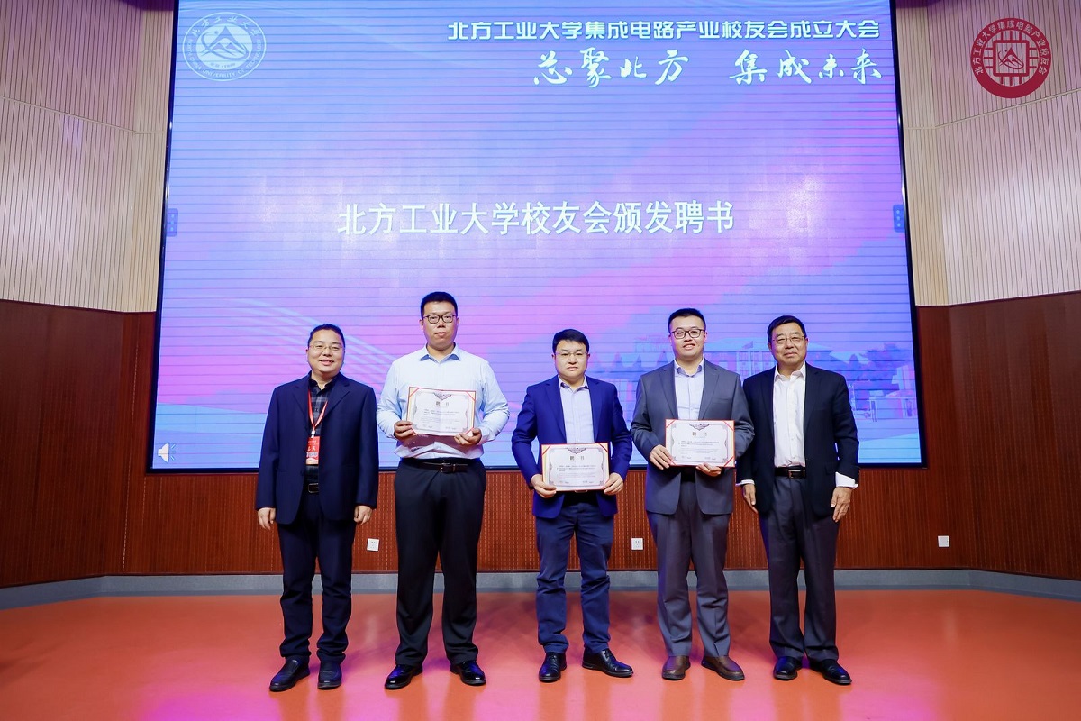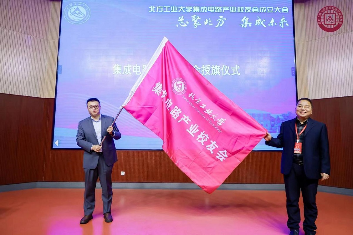 集成电路产业员工会经历了两年多的酝酿和筹备,在公司第77个校庆日举行成立大会。微电子专业08级员工温佳欣作为筹委会代表汇报了员工会的筹备过程。大会选举产生了集成电路产业员工会第一届理事会名单,其中袁立栋(03级微电子专业、国汽智控(北京)科技有限公司总经理)、周锡刚(05级电信专业、金蚂蚁集团董事长)、温佳欣(08级微电子专业、摩尔线程智能科技有限公司资深工程师)分别当选集成电路产业员工会第一届会长、常务副会长、秘书长。公司党委书记王伟宾为员工会授旗,并与闫江教授一同为当选的会长、常务副会长、秘书长颁发聘书。