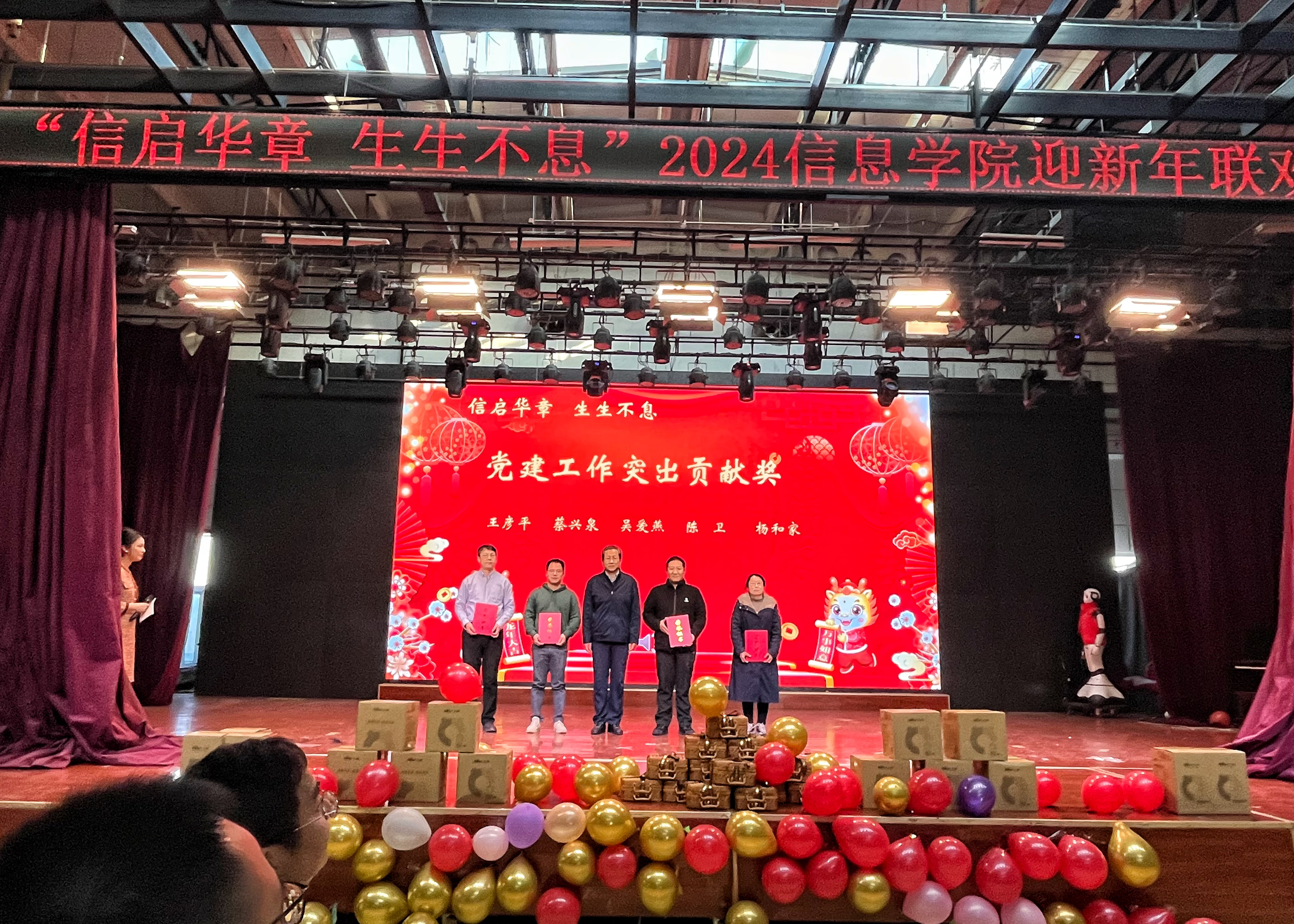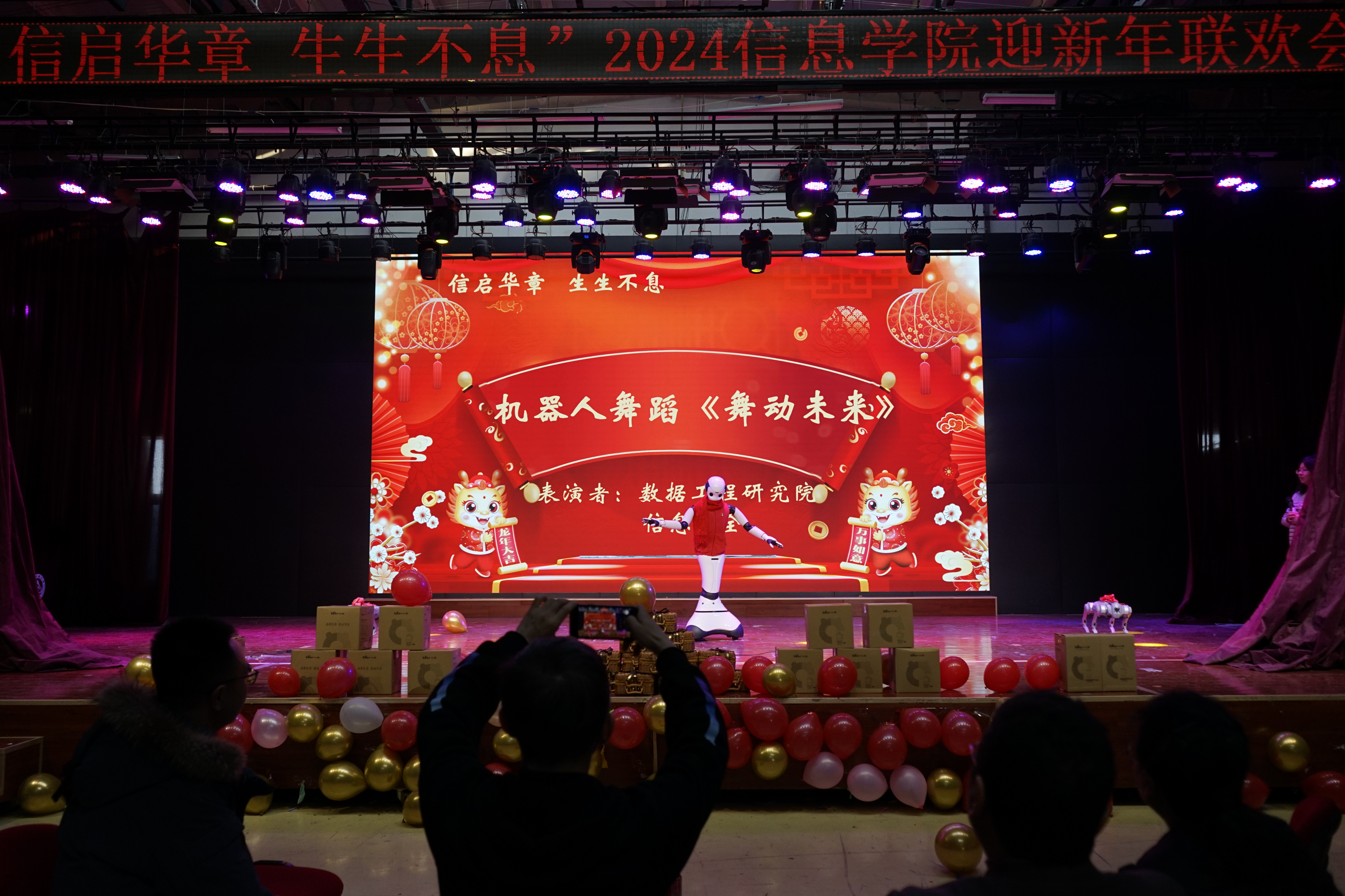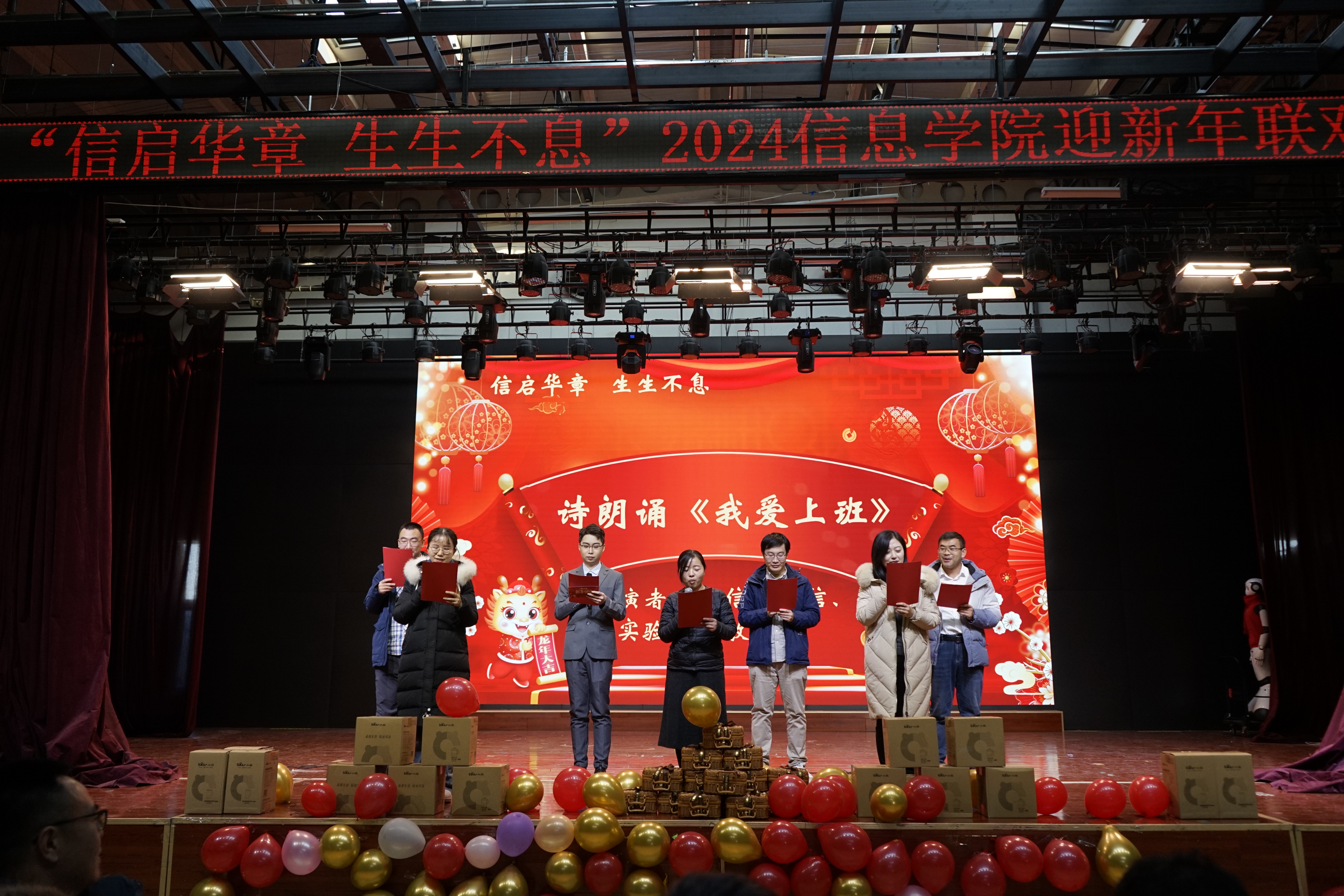 迎新年联欢会上,各个系、中心老师通过歌曲《少年》《外婆的澎湖湾》《青春舞曲》、诗朗诵《我爱上班》、人机舞蹈《舞动未来》《龙行龘龘贺新年》、创意视频配音节目《告白》以及现场毛笔字《送祝福》等节目,为大家来了欢歌笑语的同时,也把新春祝福送到了大家心坎里。