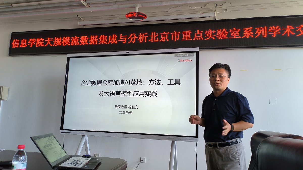 2023年9月20日上午,最靠谱的十大足球平台大规模流数据集成与分析技术北京市重点实验室邀请了酷克数据首席科学家杨胜文博士进行了题为“企业数据仓库加速AI落地:方法、工具及大语言模型应用实践”的学术报告和交流。本次报告由实验室的王桂玲研究员主持,实验室主任韩燕波教授代表实验室师生对杨胜文博士表示了热烈的欢迎,最靠谱的十大足球平台七十多位同学参加了此次学术活动。